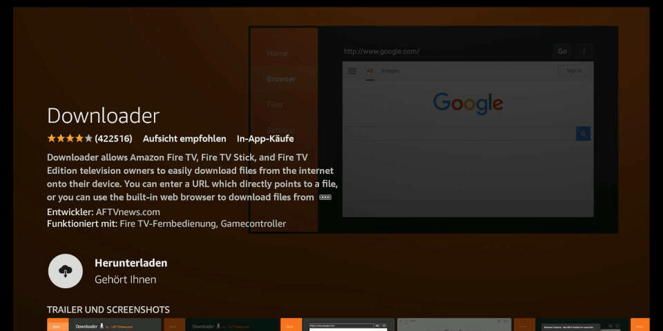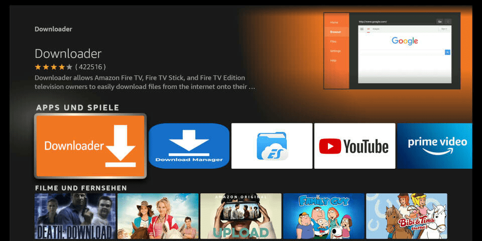 2) Enter the first letters of the word “Downloader” as a search term and select the corresponding search result using the arrow keys and the enter key on your remote control.